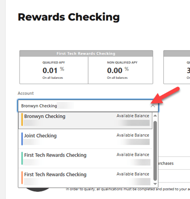Once you are on the Rewards Checking screen, you can tap the drop-down under account to change between multiple First Tech Rewards Checking accounts.