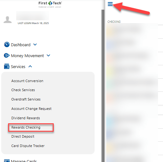 Log into the First Tech app. Click the 3 lines in the top left corner, open services and select Rewards Checking.