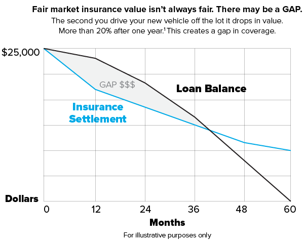 The second you drive your new vehicle off the lot it drops in value. More than 20% after one year.Car Depreciation: How Much Value Will a New Car Lose? CARFAX, Nov 9, 2018. GAP Plus may reduce or eliminate the gap between what your vehicle insurance will pay and what you owe on your loan, if your vehicle is deemed a total loss. Plus, it helps you get into your next vehicle by reducing your next loan at the credit union.